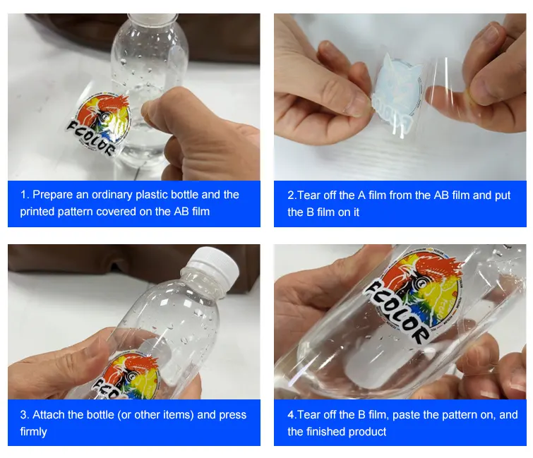 El proceso UV-DTF consta de dos partes: una lámina A y una lámina B. La lámina A se imprime directamente por el impresor con tinta UV curable. La película A se imprime directamente en la impresora, utilizando tinta curable UV. Tras la impresión, se aplica una película B, que actúa como capa adhesiva. La combinación de estas láminas permite transferir diseños duraderos y de alta calidad sobre una amplia gama de sustratos, como vidrio, cerámica y metal. El proceso de película UV DTF A&B es aclamado por su ausencia de residuos y de cola, ya que incorpora cola de polímero para mejorar la adherencia y la solidez, lo que hace que los diseños impresos sean robustos y menos propensos a desprenderse del sustrato.